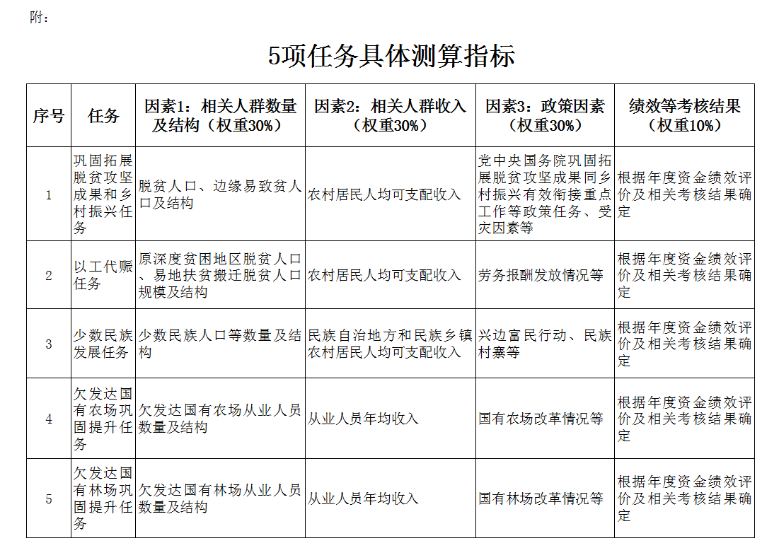 第二條 銜接資金按照鞏固拓展脫貧攻堅成果和鄉村振興、以工代賑、少數民族發展、欠發達國有農場鞏固提升、欠發達國有林場鞏固提升、“三西”農業建設任務進行分配。資金分配按照因素法進行測算,因素和權重為:相關人群數量及結構30%、相關人群收入30%、政策因素30%、績效等考核結果10%,并進行綜合平衡。各項任務按照上述因素分別確定具體測算指標(詳見附件)。“三西”農業建設任務按照國務院批準的規模安排。