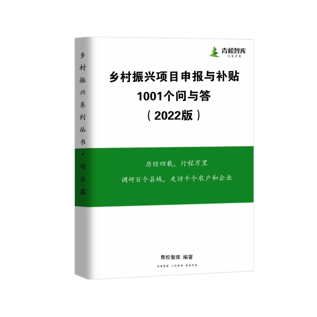 歷經四載,行程萬里,調研百個縣域,走訪千家農戶(或企業(yè)),凝聚匠心,由青松智庫編制的《鄉(xiāng)村振興項目申報與補貼1001個問與答》內部資料,數量有限,是常用工作參考工具書,有需要的請加緊與青松智庫聯系。