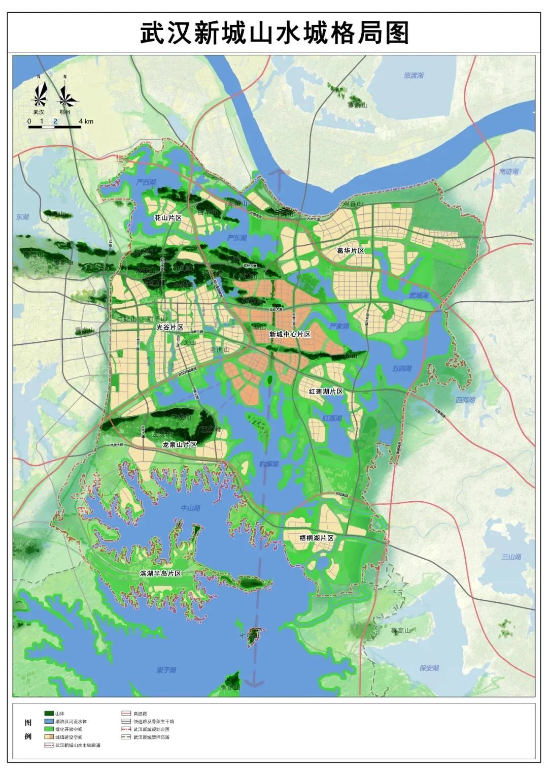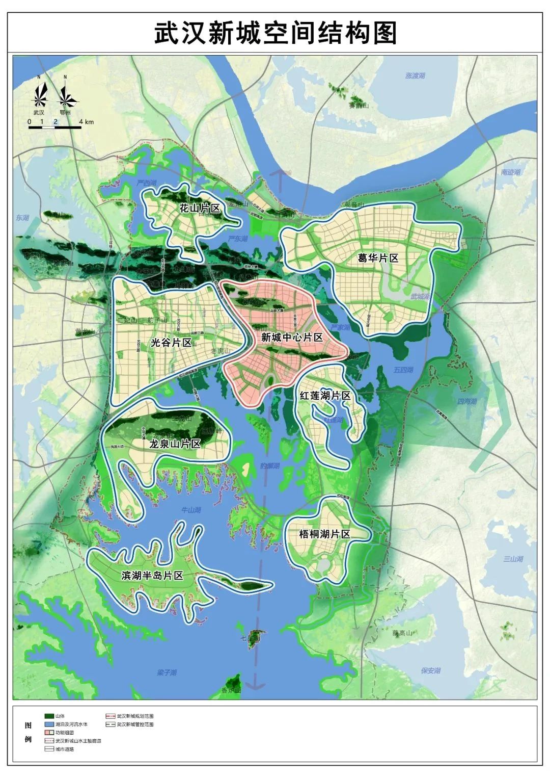 按照“山水城、家園城、智慧城”三大目標,構建山湖相映、組團發展的空間結構,劃分新城中心片區、光谷片區、葛華片區、花山片區、龍泉山片區、紅蓮湖片區、梧桐湖片區、濱湖半島片區共8大片區,形成產城融合、功能復合的空間布局。
