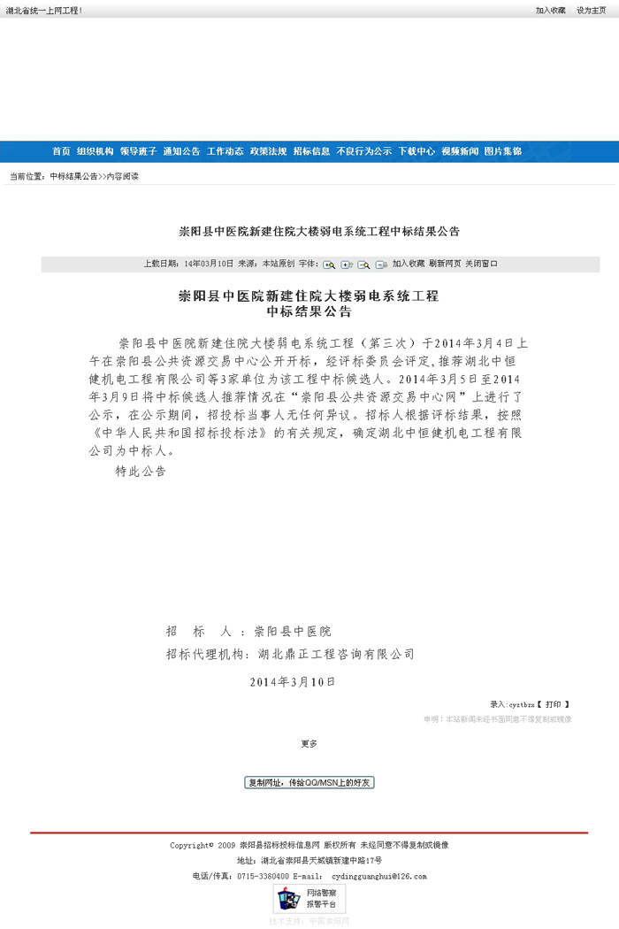 崇陽(yáng)縣中醫(yī)院新建住院大樓弱電系統(tǒng)工程中標(biāo)結(jié)果公告