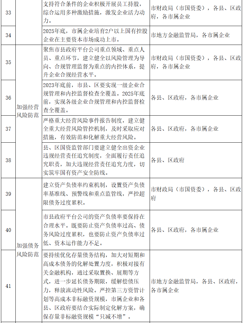 14.加強債務風險防范。建立健全資產負債率約束機制,設置資產負債率基準線、預警線和重點監管線,嚴控超限債務過度累積。市縣政府平臺公司的資產負債率要保持在合理水平,既要防止資產負債率過高、債務風險過度累積,也要防止資產負債率過低、資本運作能力不足。要持續優化存量債務結構,加大對短期和高成本債務的化解處置力度,積極對接有關金融機構,通過采取置換、展期等方式,進一步延長債務期限,緩解償債壓力,釋放流動性風險。嚴控第三方資管計劃等高成本非標融資規模,市屬企業和各縣、區政府要結合實際制定化解方案,確保存量非標融資規模“只減不增”。〔責任單位:市財政局(市國資委)、市地方金融監管局,各縣、區政府,各市屬企業〕