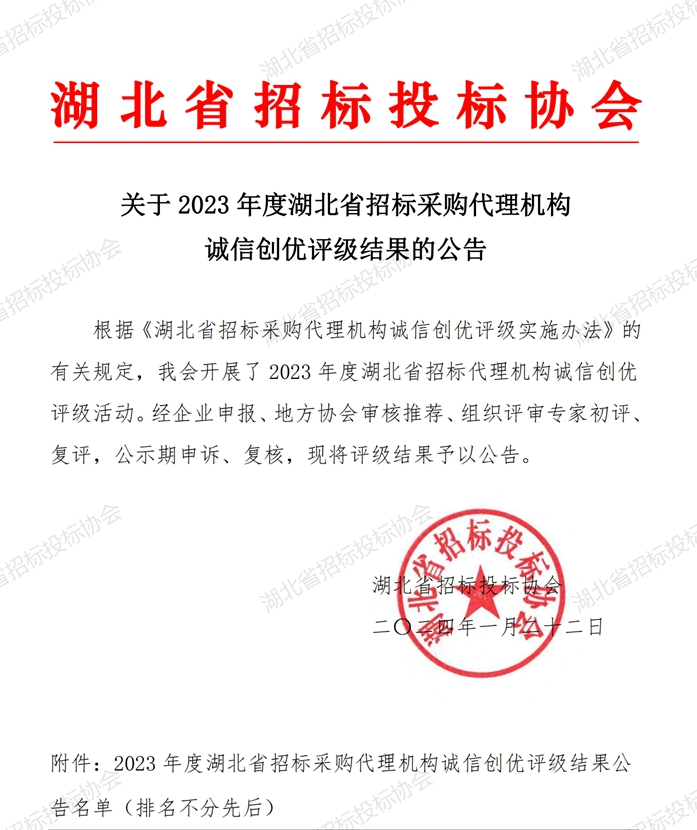 此次評選是湖北省招投標協(xié)會根據(jù)《關于建立完善守信聯(lián)合激勵和失信聯(lián)合懲戒制度加快推進社會誠信建設的指導意見》要求和《政府采購招標代理機構管理辦法》及相關法律法規(guī)規(guī)定,按照“自愿、公開、公平、公正、非營利”原則,在會員單位內開展“湖北省招標投標行業(yè)招標采購代理機構誠信創(chuàng)優(yōu)評級”活動。