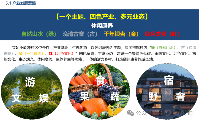 其中,雙河村通過發(fā)揮特色農(nóng)業(yè)產(chǎn)業(yè)優(yōu)勢(shì)建設(shè)農(nóng)業(yè)品牌,延伸農(nóng)業(yè)加工產(chǎn)業(yè)鏈開啟創(chuàng)收新征程,積極發(fā)展鄉(xiāng)村休閑業(yè)打造詩(shī)意田園水鄉(xiāng),主要打造田園綜合體、濱河休閑體驗(yàn),拓展農(nóng)業(yè)休閑旅游業(yè)態(tài)。泉水寺村重點(diǎn)結(jié)合國(guó)家級(jí)專用汽車和應(yīng)急裝備檢測(cè)研發(fā)基地的建設(shè)基礎(chǔ),構(gòu)建以產(chǎn)業(yè)基地配套服務(wù)為主導(dǎo),以生態(tài)種養(yǎng)、休閑農(nóng)業(yè)為特色的產(chǎn)業(yè)體系。小嶺沖村重點(diǎn)整合“綠(自然山水)、古(晚清古寨)、金(千年銀杏)、紅(紅色文化)”四色資源,構(gòu)建“綠+古+金+紅”四色產(chǎn)業(yè),打造品質(zhì)活力鄉(xiāng)村旅游。九口堰村重點(diǎn)以豐富的紅色文化、自然資源為基礎(chǔ),以紅色文化體驗(yàn)為主導(dǎo)產(chǎn)業(yè),以文化帶動(dòng)旅游,拓展紅色體驗(yàn)、康養(yǎng)度假等產(chǎn)業(yè),打造全國(guó)紅色教育示范基地。