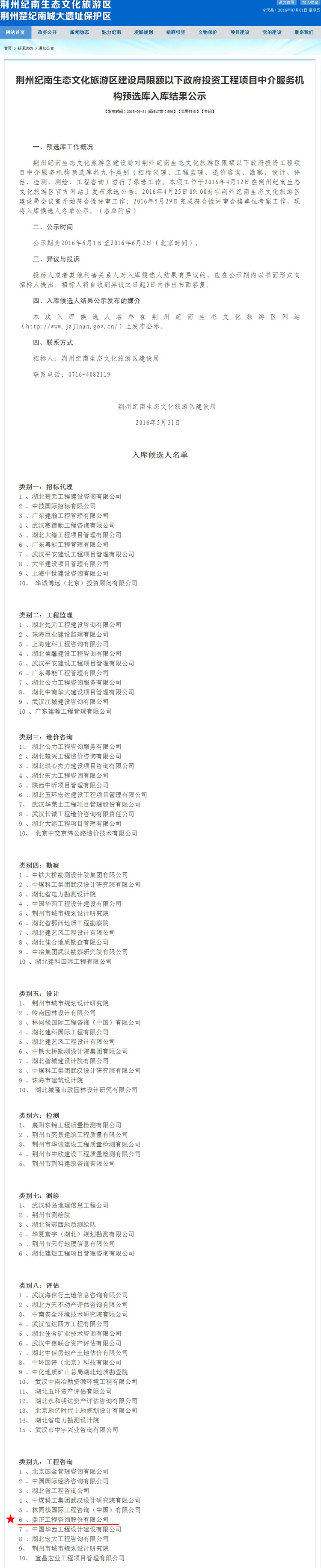 【經營成果】我司入圍荊州紀南生態文化旅游區建設局限額以下政府投資工程項目中介服務機構預選庫